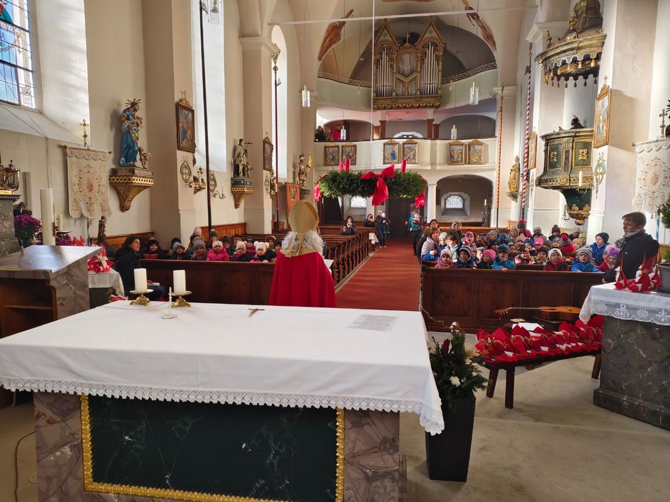 Aus der Sakristei kam der Heilige Nikolaus mit seinem goldenen Buch und seinem goldenen Stab.